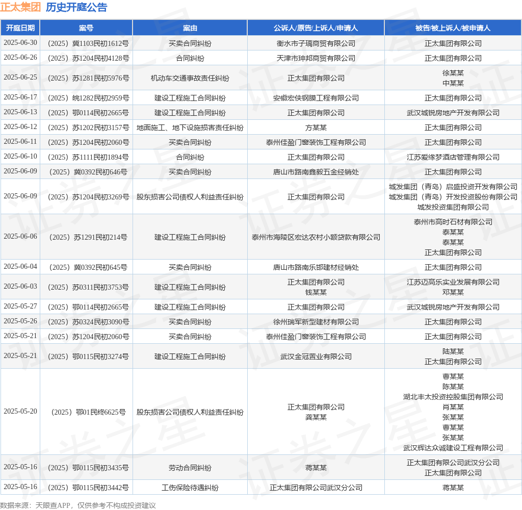 案号:(2025)苏1281民初5976号审理法院:兴化市人民法院案由:机动车交通事故责任纠纷当事人信息: 原告/上诉人:正太集团有限公司 被告/被上诉人:徐某某、中某某开庭日期:2025年6月25日根据统计,近一年内以正太集团有限公司为当事人的历史开庭公告有213则,其中案由为“建设工程施工合同纠纷”的公告以65则居首,其次为“买卖合同纠纷”有48则,“劳务合同纠纷”有16则。历史开庭公告(前20条)如下: